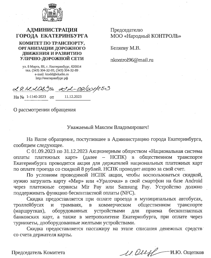 Публикуем ранее поступивший ответ по обращению жителей города Екатеринбурга по вопросу законности разности цен на проезд.