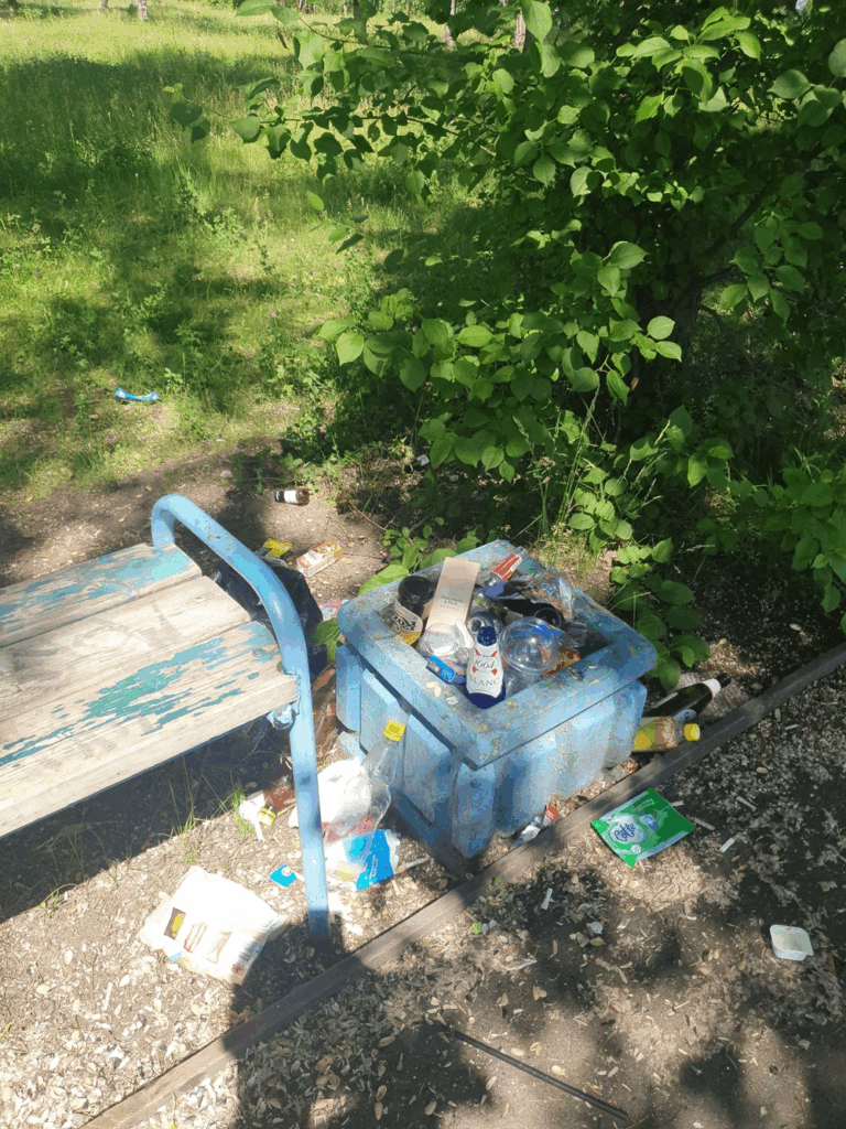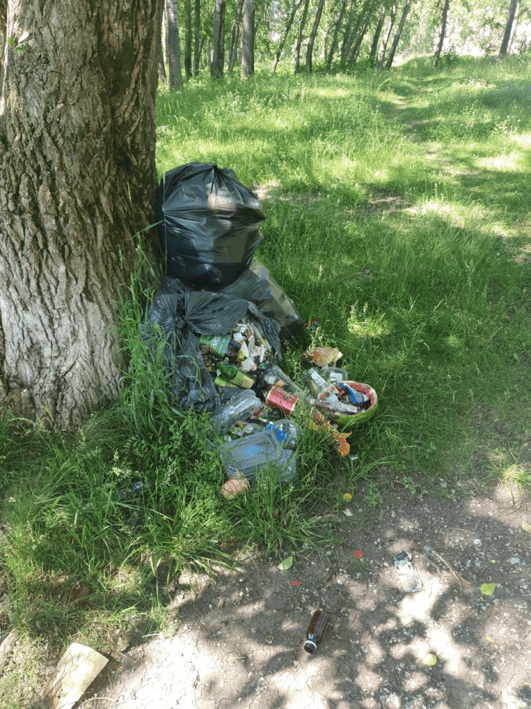 07.07.24. Екатеринбург, парк за Теннисной академией, ул. Бисертская, 128.Много неубранного мусора, полные урны.