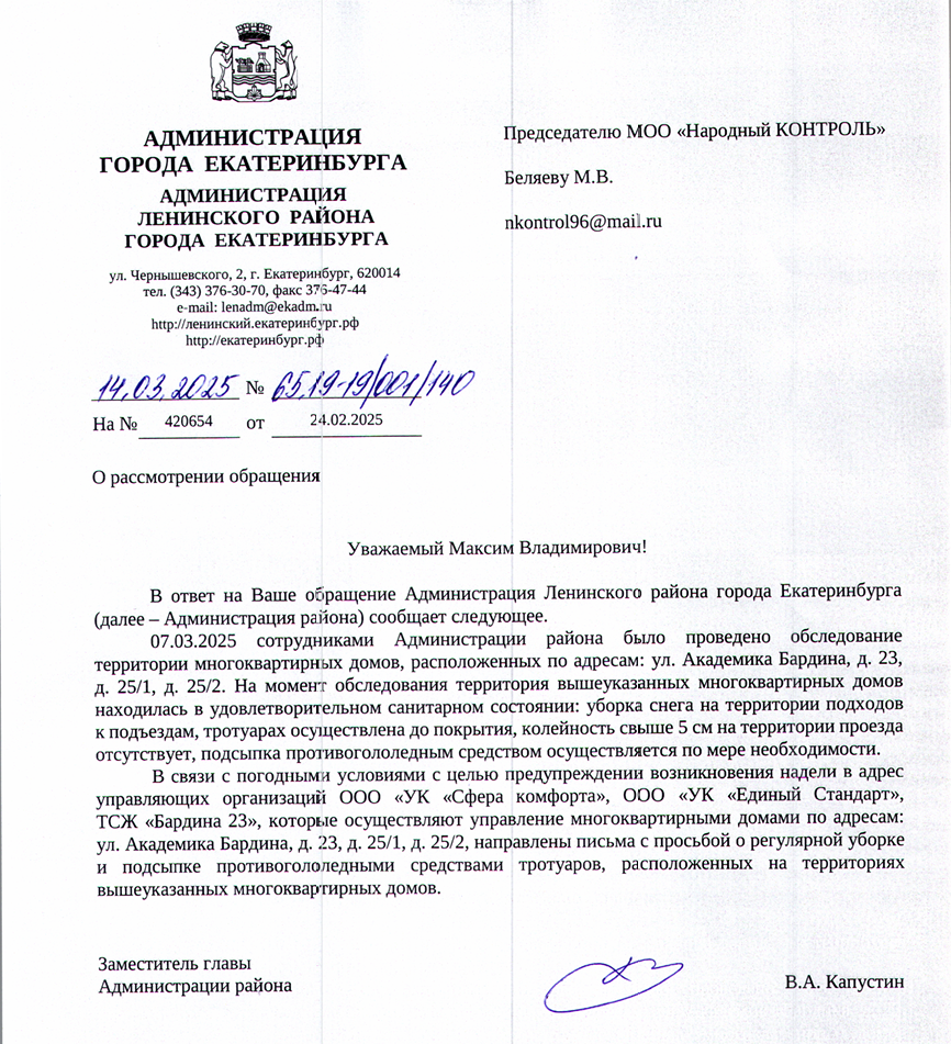 В управляющие компании ООО «УК «Сфера комфорта», ООО «УК «Единый Стандарт» и ТСЖ «Бардина 23» были направлены письма с просьбой о регулярной уборке и подсыпке тротуаров.