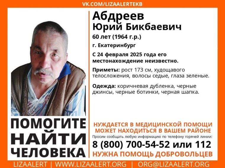 В Екатеринбурге ушел из дома и не вернулся 60-летний Абдеев Юрий Бикбаевич, ему требуется медицинская помощь.