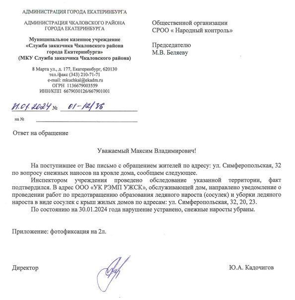 Публикуем ранее поступивший ответ по обращению жителей города Екатеринбурга по вопросу чистки крыш на улице Симферопольской.