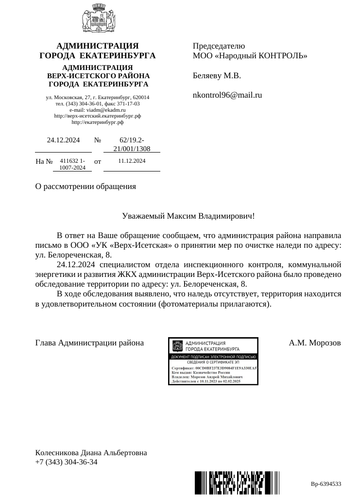 Администрация Верх-Исетского района отреагировала на обращение, направив письмо в адрес управляющей компании ООО «УК Верх-Исетская» с требованием принять меры по очистке наледи.