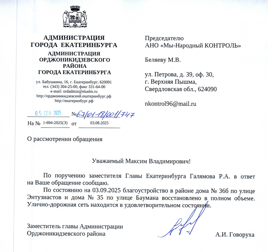 В ответ на обращение администрация Орджоникидзевского района сообщила, что по поручению заместителя главы города по состоянию на 3 сентября благоустройство территории было полностью восстановлено. Улично-дорожная сеть приведена в удовлетворительное состояние, что устранило все ранее указанные жителями неудобства.