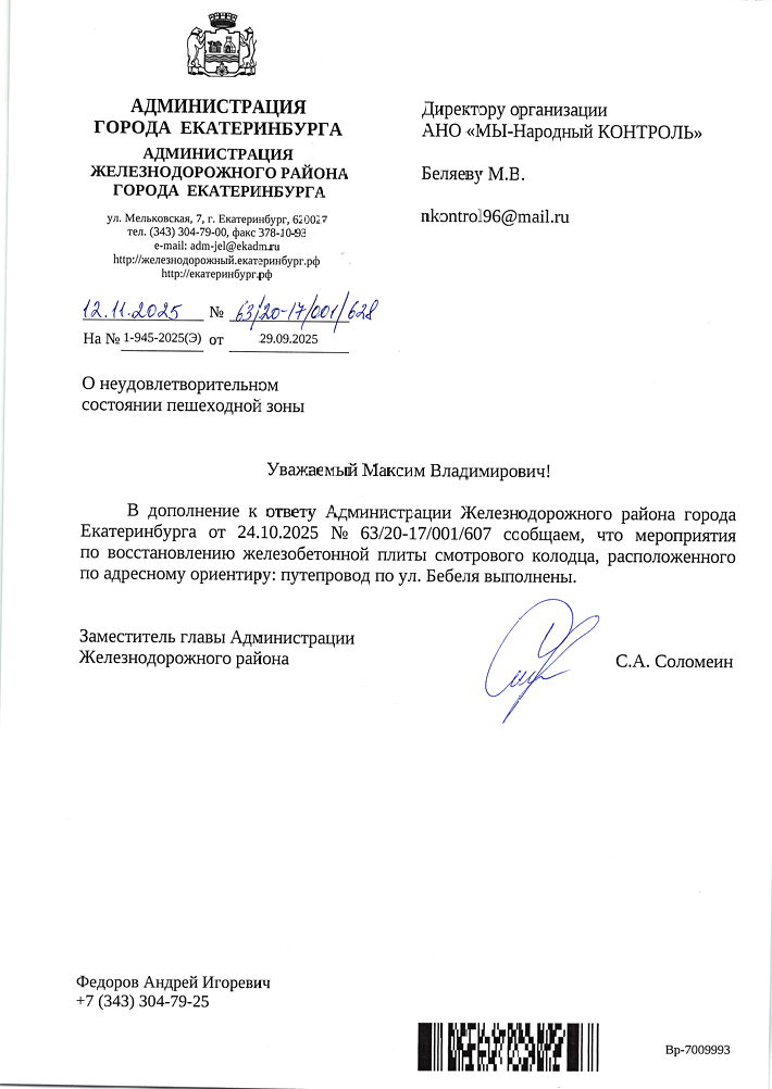 Согласно новому ответу администрации, мероприятия по восстановлению железобетонной плиты смотрового колодца на путепроводе по улице Бебеля завершены. Таким образом, выявленное ранее повреждение устранено, и пешеходная зона приведена в безопасное состояние.