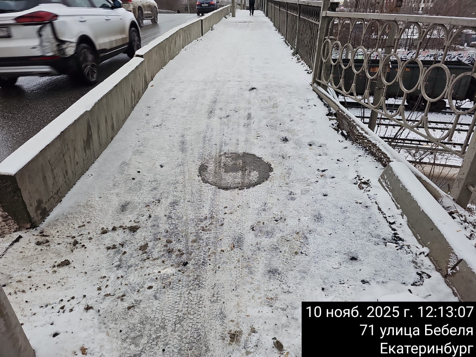 В конце сентября из Екатеринбурга поступило обращение о повреждении пешеходной зоны на мосту по улице Бебеля. По словам жителей, на участке образовалась крупная яма, которая представляла опасность для прохожих. Горожане просили устранить дефект, чтобы предотвратить возможные травмы.
