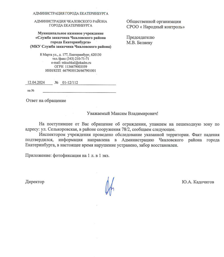 Инспектором учреждения проведено обследование указанной территории. Факт падения подтвердился, информация направлена в Администрацию Чкаловского района города Екатеринбурга, в настоящее время нарушение устранено, забор восстановлен.