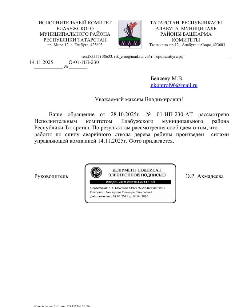На обращение был получен ответ от Исполнительного комитета Елабужского муниципального района Республики Татарстан.