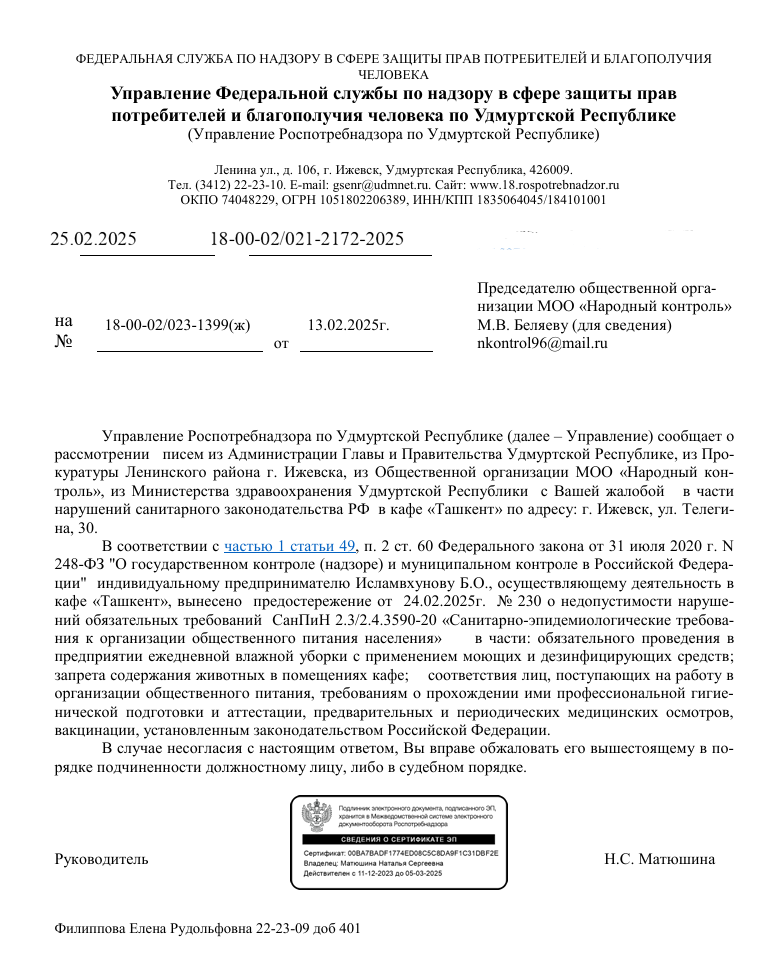 По жалобе, направленной в Роспотребнадзор, было проведено рассмотрение с участием нескольких инстанций, включая прокуратуру и Министерство здравоохранения Удмуртии. В результате индивидуальному предпринимателю, ведущему деятельность в кафе, вынесено предостережение о недопустимости нарушений санитарных норм. В документе указаны требования о запрете содержания животных в заведении, обязательном проведении влажной уборки с дезинфицирующими средствами, а также соблюдении санитарных норм персоналом.