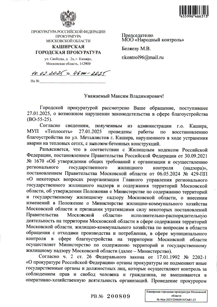 Благодарим неравнодушных граждан за Ваши обращения. Если Вы не согласны с данным ответом Каширской городской прокуратуры, пожалуйста, сообщите об этом Нам (желательно с фото/видео доказательствами выполнения работы в неполном объеме или ее невыполнении).