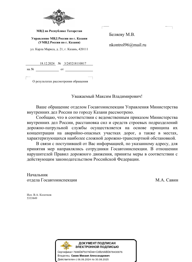 Благодарим неравнодушных граждан за Ваши обращения. Если Вы не согласны с данным ответом УМВД России по республике Татарстан, пожалуйста, сообщите об этом Нам (желательно с фото/видео доказательствами выполнения работы в неполном объеме или ее невыполнении).