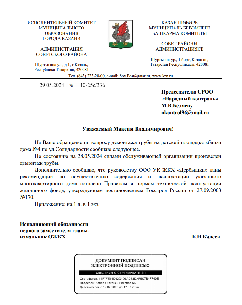 Публикуем ранее поступивший ответ по обращению жителей города Казань по вопросу демонтажа труба на детской площадке на ул. Солидарности.