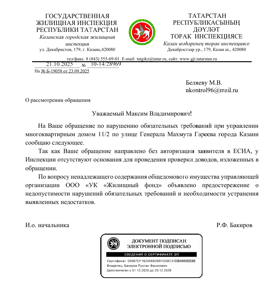 В официальном ответе указано, что обращения были рассмотрены без проведения проверки, поскольку они поступили без авторизации заявителя через ЕСИА.
