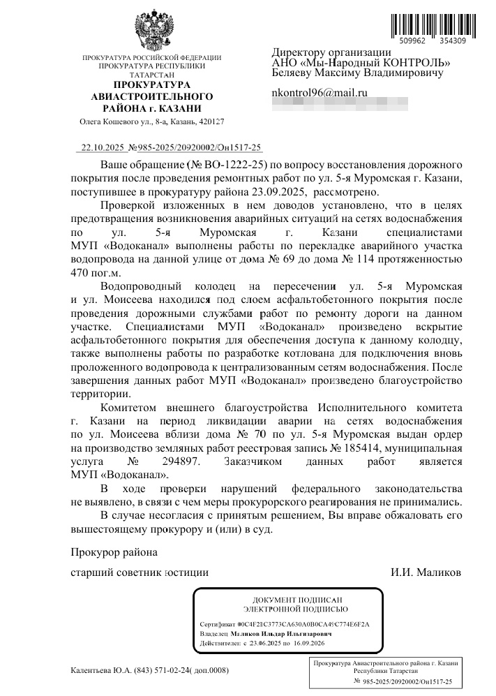 Благодарим неравнодушных граждан за Ваши обращения. Если Вы не согласны с данным ответом Прокуратуры Авиастроительного района города Казани, пожалуйста, сообщите об этом Нам (желательно с фото/видео доказательствами выполнения работы в неполном объеме или ее невыполнении).