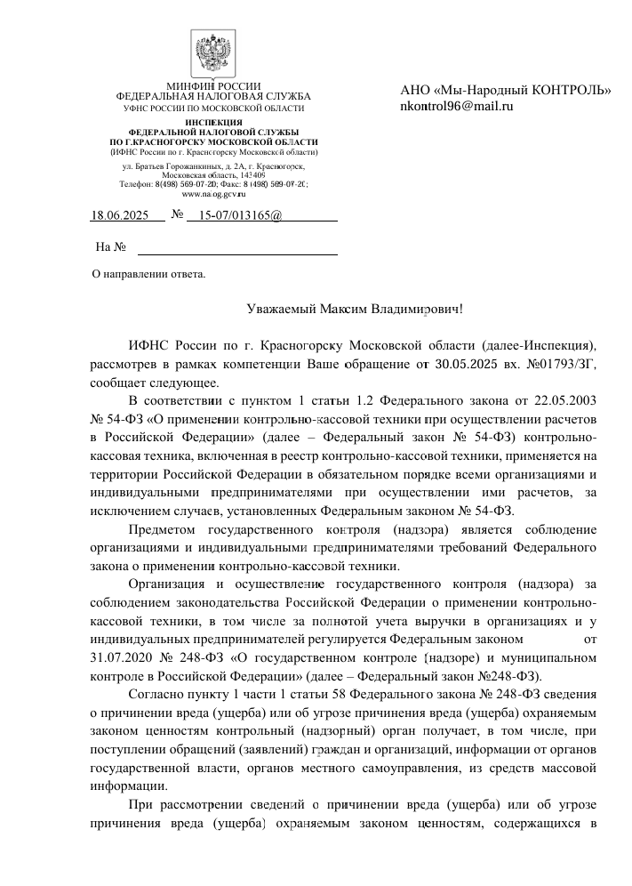 По факту обращений ИФНС России по г. Красногорску провела проверку.