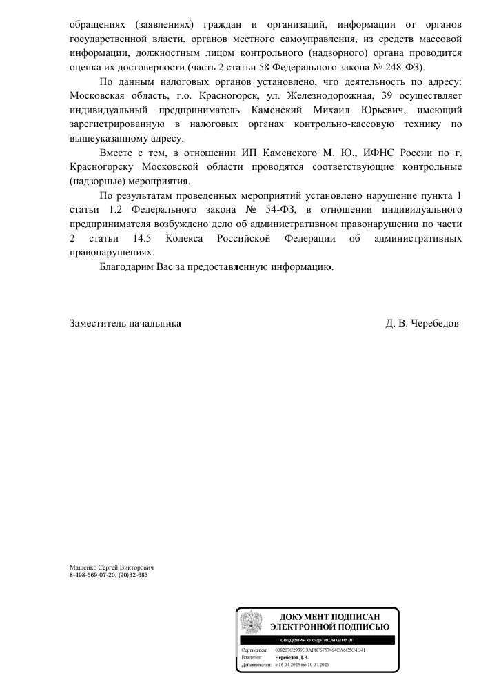 В ходе проверки установлено, что магазин по адресу ул. Железнодорожная, 39 принадлежит индивидуальному предпринимателю М.Ю. Каменскому, который имеет зарегистрированную контрольно-кассовую технику. Однако выявлены нарушения требований закона о применении кассовых аппаратов. В отношении предпринимателя возбуждено административное дело по статье 14.5 Кодекса Российской Федерации об административных правонарушениях.