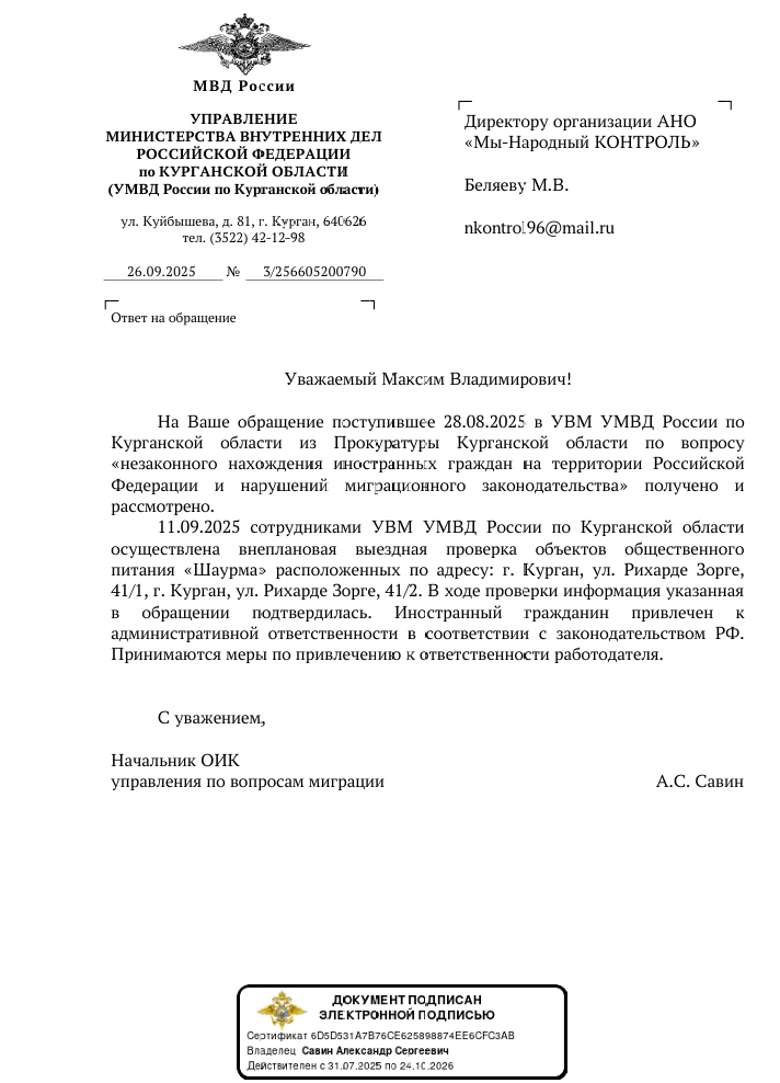 По результатам проверки Управлением по вопросам миграции УМВД России по Курганской области 11 сентября была проведена внеплановая выездная проверка.