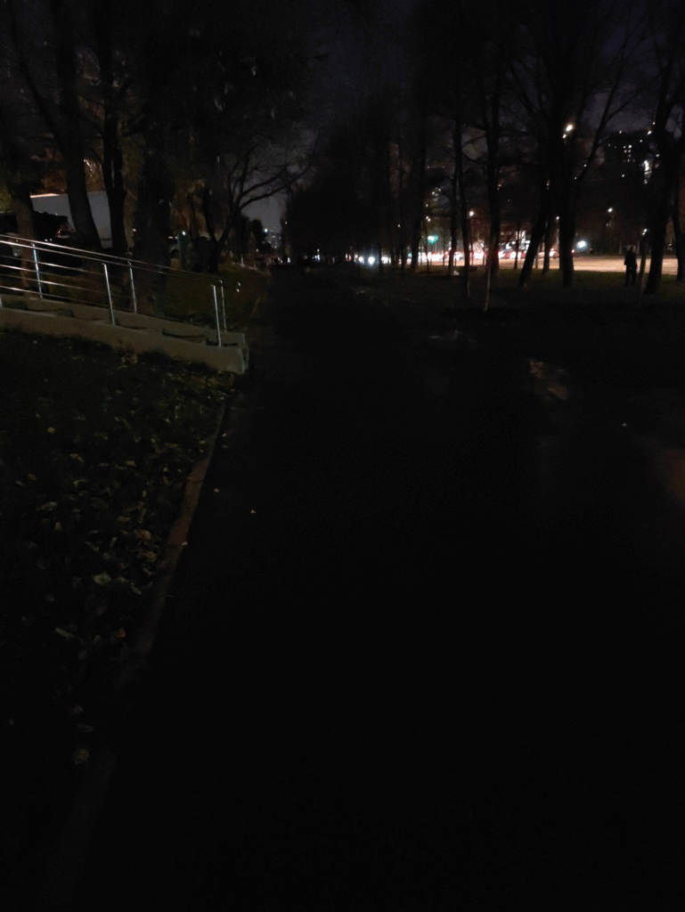 Пешеходный переход на Нахимовском проспекте полностью лишён освещения. Ничего не видно, тротуар не освещён.