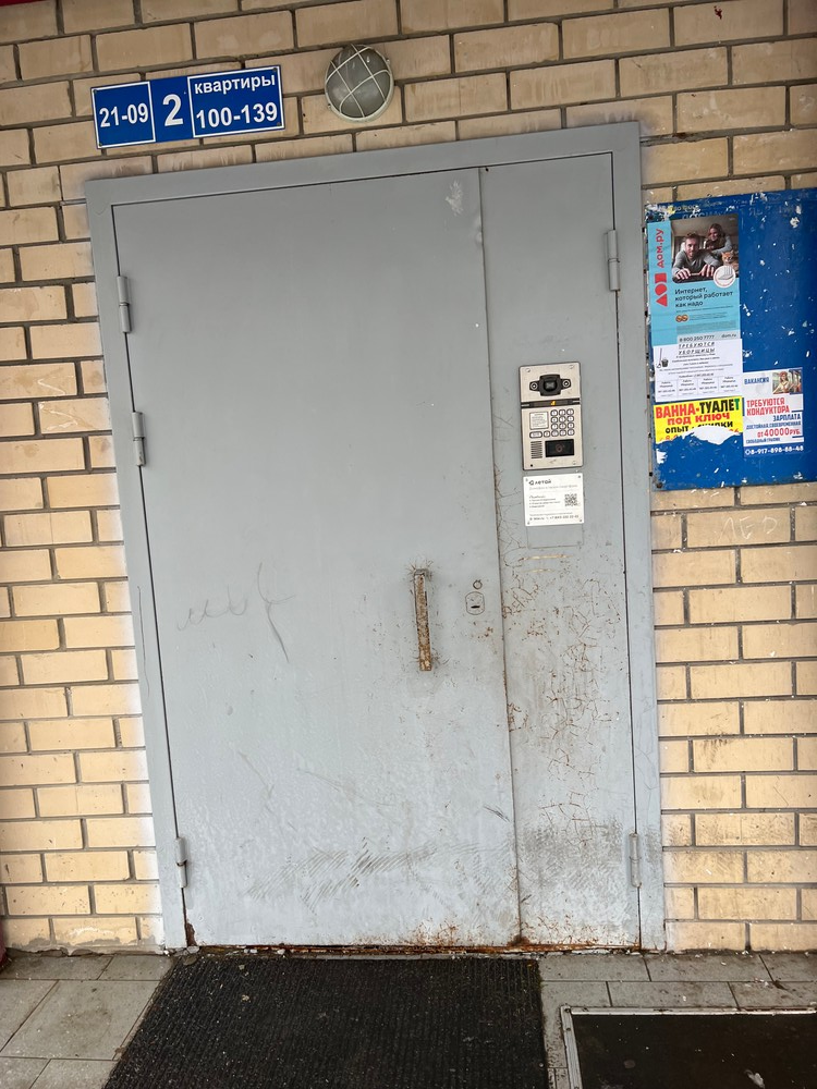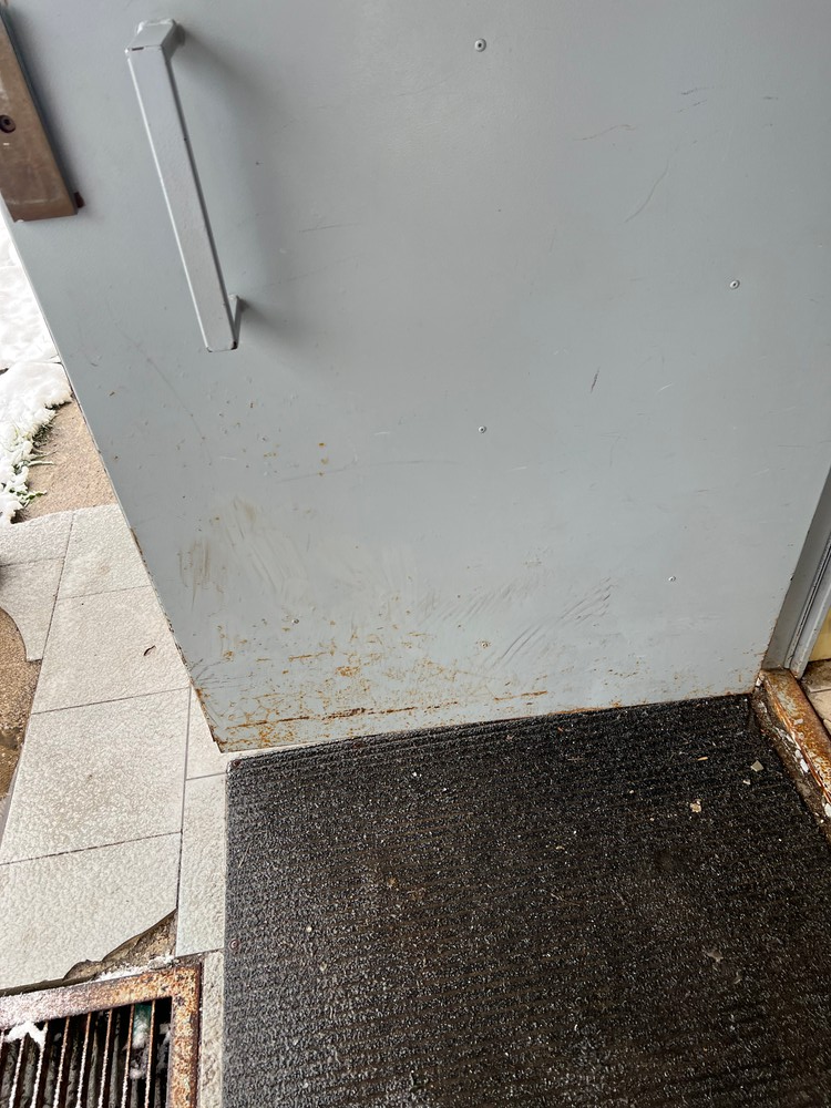 Город Набережные Челны, улица Нур Баян, дом 9, 2 подъезд. Низ двери полностью сгнил, через образовавшуюся щель в подъезд заходят мыши. Дверь и перила требуют покраски. Перед входом вся плитка сломана. Косметический ремонт в подъезде не проводился ни разу со сдачи дома. Дом сдан в 2017 году.