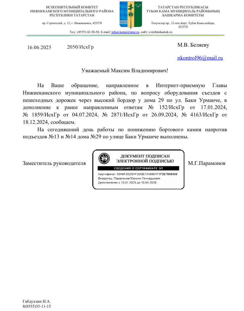 Благодарим неравнодушных граждан за Ваши обращения. Если Вы не согласны с данным ответом Исполнительного комитета Нижнекамского муниципального района, пожалуйста, сообщите об этом Нам (желательно с фото/видео доказательствами выполнения работы в неполном объеме или ее невыполнении).