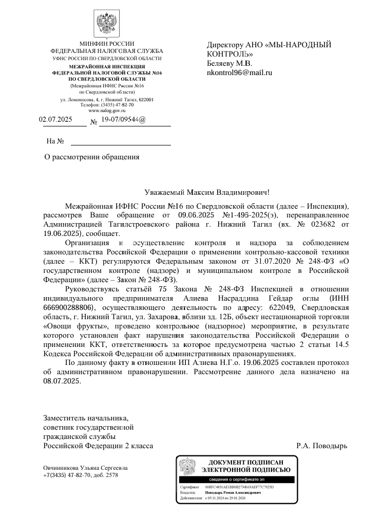 На это обращение Межрайонная ИФНС №16 по Свердловской области провела контрольное мероприятие в отношении предпринимателя Алиева Насраддина Гейдар оглы. Проверка подтвердила нарушение закона о применении контрольно-кассовой техники. В отношении ИП был составлен протокол об административном правонарушении, рассмотрение которого назначено на 8 июля.
