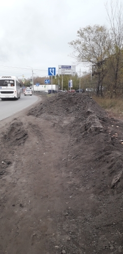 Но там, как видно на фото, очень часто портит тропинку грейдер — разравнивает обочину и оставляет горы земли, через которые в дождливую погоду не пройти совсем, и людям приходится выходить и идти по проезжей части.