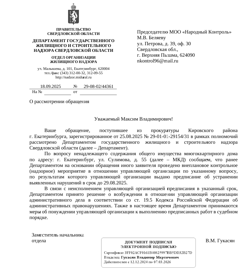 На новое обращение был получен ответ от Департамента государственного жилищного и строительного надзора Свердловской области.