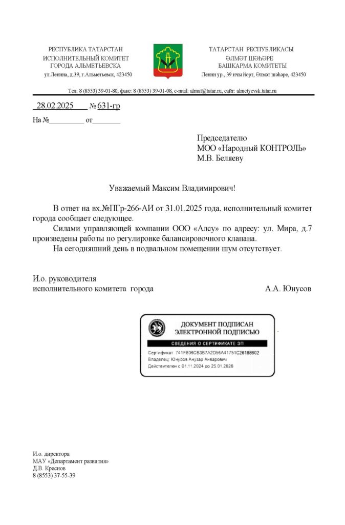 После вмешательства исполнительного комитета города управляющая компания ООО «Алсу» провела работы по регулировке балансировочного клапана. Как сообщили власти, на данный момент шум в подвальном помещении отсутствует.