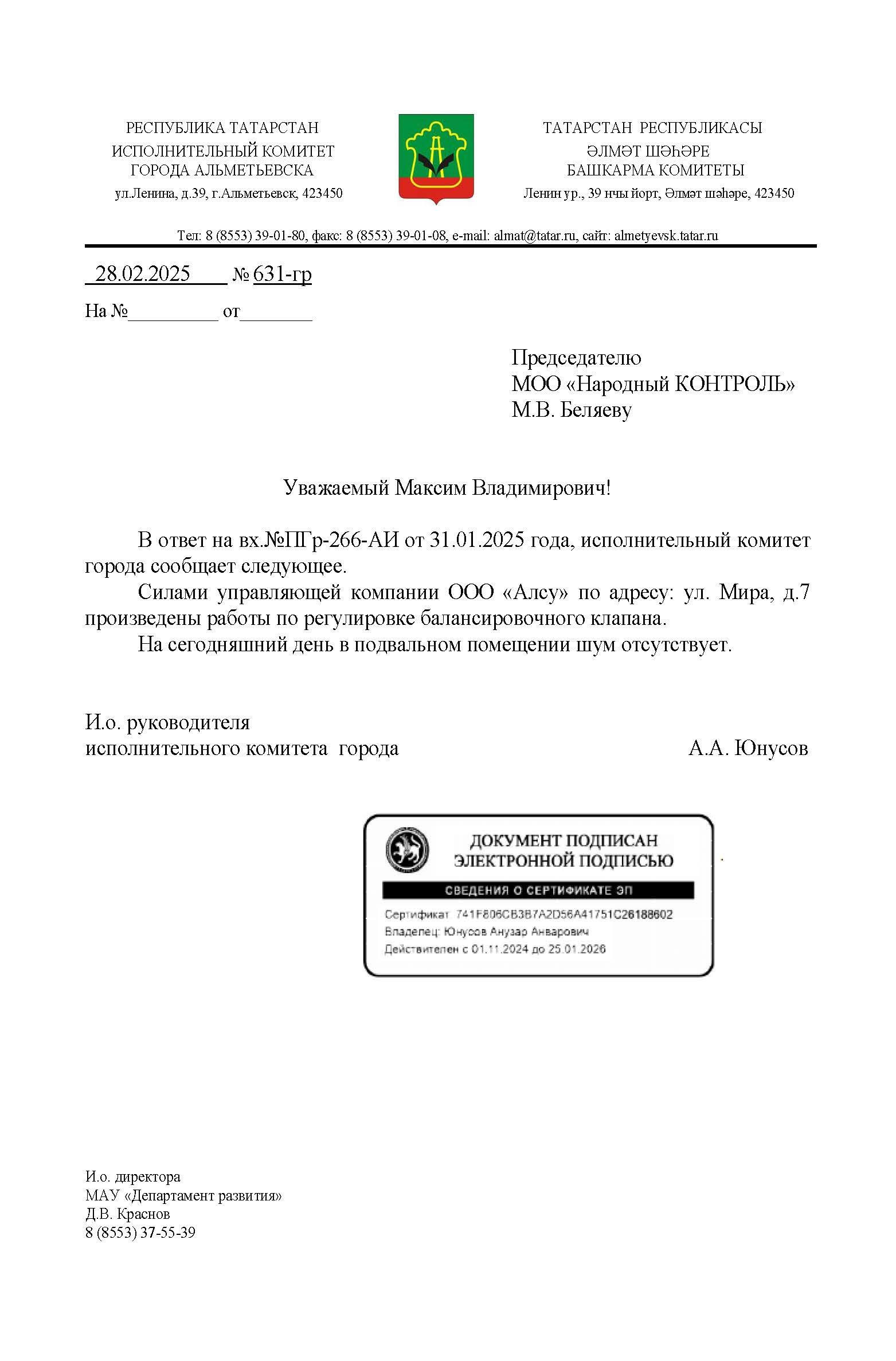 После вмешательства исполнительного комитета города управляющая компания ООО «Алсу» провела работы по регулировке балансировочного клапана. Как сообщили власти, на данный момент шум в подвальном помещении отсутствует.