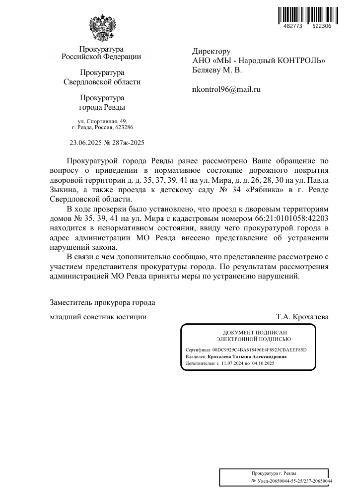 На это обращение 23 мая был получен ответ: прокуратура установила, что проезд к домам №35, 39 и 41 по ул. Мира относится к муниципальной собственности и находится на балансе администрации МО «Город Ревда». В связи с выявленными нарушениями в адрес администрации было внесено представление об устранении нарушений.