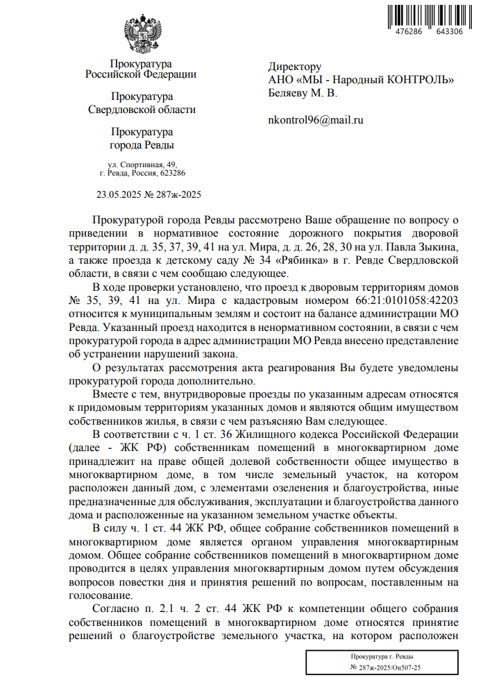 Благодарим неравнодушных граждан за Ваши обращения. Если Вы не согласны с данным ответом Прокуратуры города Ревды, пожалуйста, сообщите об этом Нам (желательно с фото/видео доказательствами выполнения работы в неполном объеме или ее невыполнении).