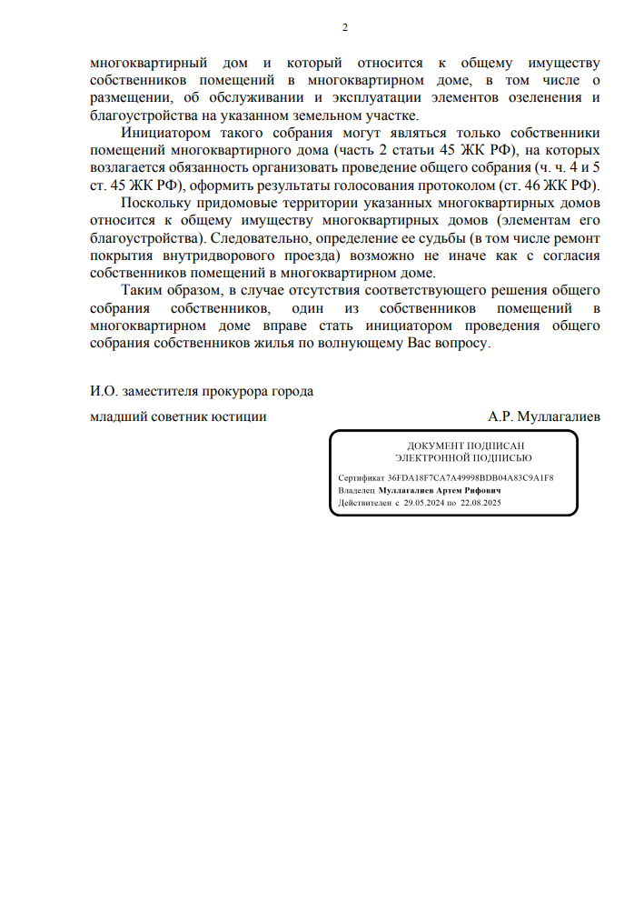 Что касается внутридворовых проездов к остальным домам, то они признаны частью придомовой территории и относятся к общему имуществу собственников жилья. Прокуратура напомнила, что решение о проведении работ на таких участках должно приниматься на общем собрании жильцов, так как именно они вправе распоряжаться элементами благоустройства, включая внутридворовые дороги.