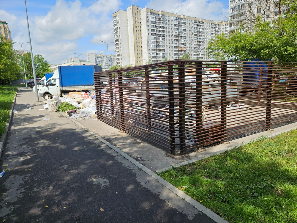 г. Москва, Северное Бутово, стоянка возле дома ул. Коктебельская, д.8. Из площадки для мусора всё время делают свалку – как на фото. А ГБУ «Жилищник», который организует уборку 1) малым количеством персонала, 2) из «иностранных специалистов» – особенно на участках #2 и #5 – ничего не предпринимает по этому поводу. И даже когда нажалуешься, ничего не делают, пока не подойдёт время очередного вывоза (раз в 10-14 дней), а до этого вонища, крысы, свалка на полсквера. Дескать, так заключён контракт на вывоз мусор.