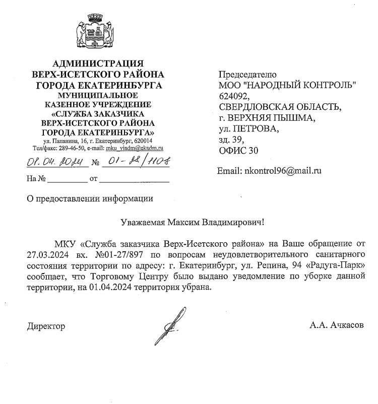 МКУ «Служба заказчика Верх-Исетского района» на Ваше обращение от 27.03.2024 вх. №01-27/897 по вопросам неудовлетворительного санитарного состояния территории по адресу: г. Екатеринбург, ул. Репина, 94 «Радуга-Парк» сообщает, что Торговому Центру было выдано уведомление по уборке данной территории, на 01.04.2024 территория убрана.