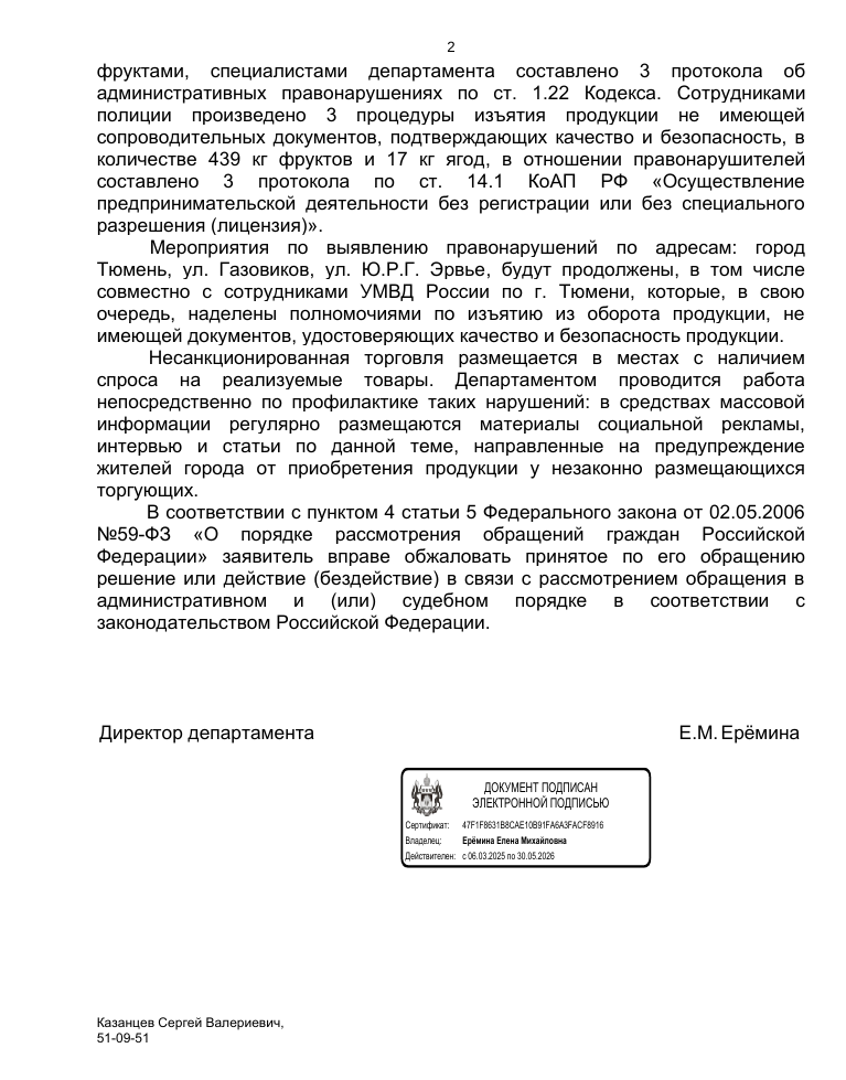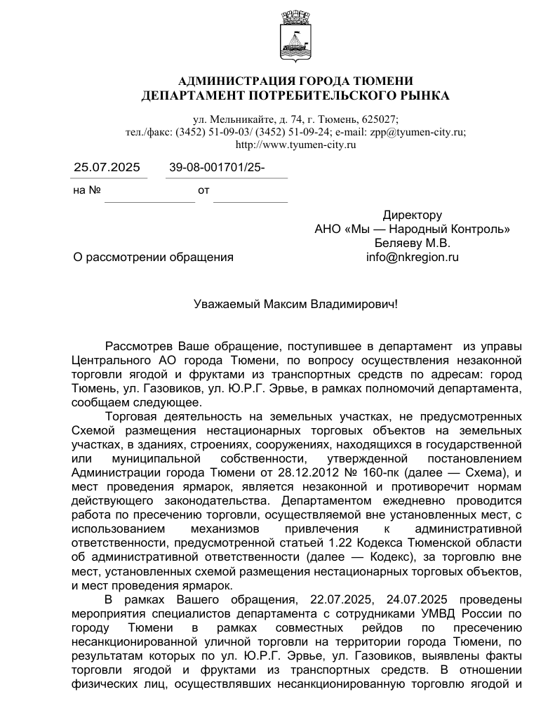 На это обращение был получен ответ от департамента потребительского рынка администрации города Тюмени.