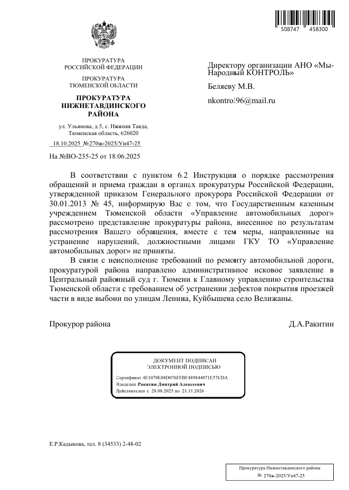Ранее, по результатам проверки прокуратура Нижнетавдинского района полностью подтвердила факты, изложенные в обращении жителей. В адрес руководства Государственного казенного учреждения Тюменской области «Управление автомобильных дорог» было направлено представление с требованием устранить выявленные нарушения.