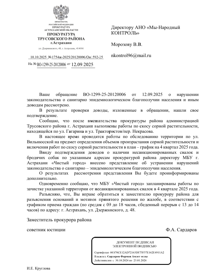 Благодарим неравнодушных граждан за Ваши обращения. Если Вы не согласны с данным ответом Прокуратуры Трусовского района города Астрахани, пожалуйста, сообщите об этом Нам (желательно с фото/видео доказательствами выполнения работы в неполном объеме или ее невыполнении).