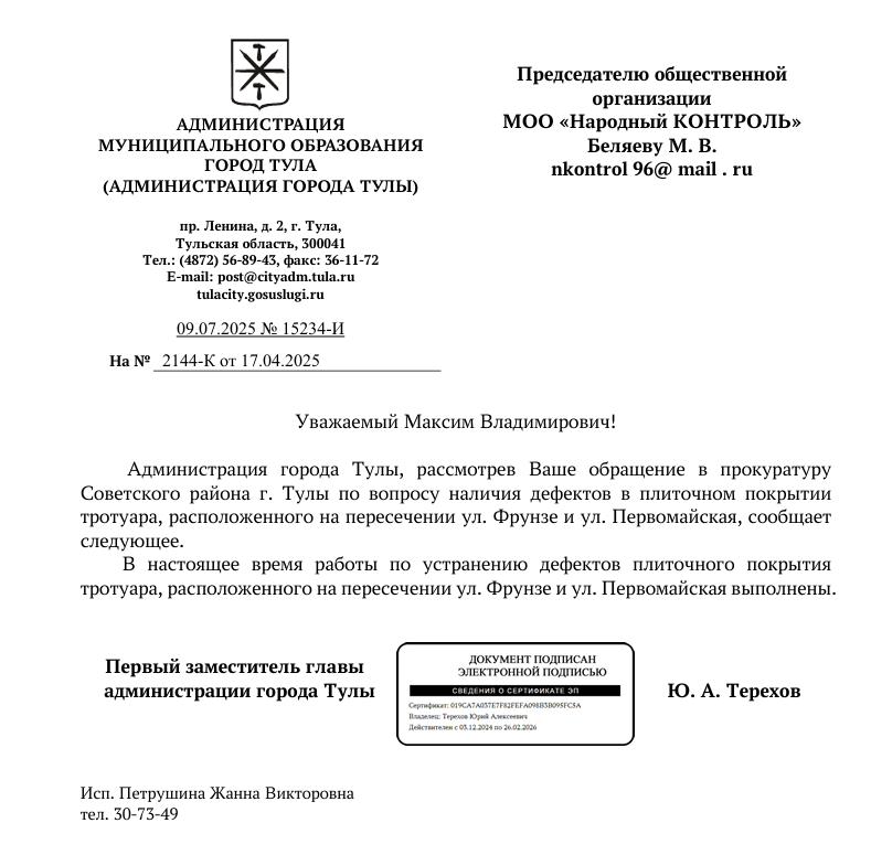 В марте этого года из Тулы было получено обращение о неудовлетворительном состоянии тротуара на пересечении улиц Фрунзе и Первомайской. Жители, в том числе родители с колясками, годами испытывали трудности при передвижении по разбитому покрытию. В 2024 году заявитель уже обращалась с жалобой, однако тогда в ремонте отказали, сославшись на отсутствие финансирования. После очередного отказа в марте 2025 года обращение было направлено в прокуратуру.