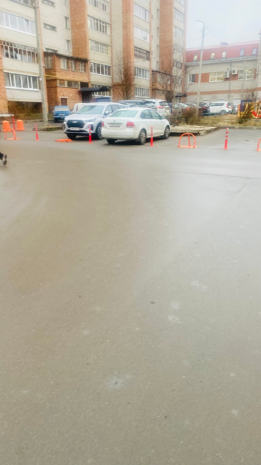Незаконно установлены ограждения для парковки, автомобилями перекрывается тротуар между домами по адресу: Вологда, ул. Ярославская, 25 и Ярославская, 25А. Фотография сделана 12.03.2025 в 17:45.