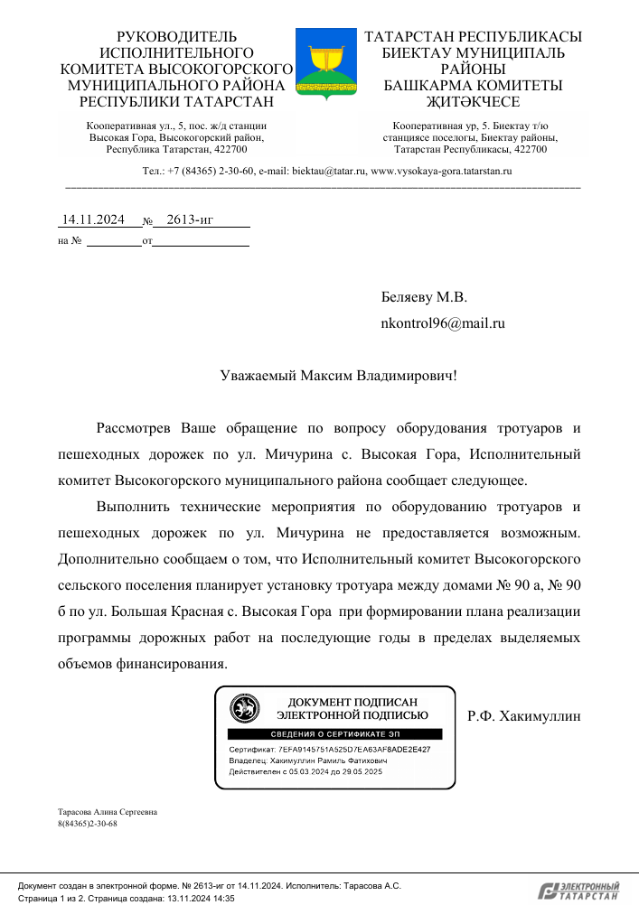 На это обращение был получен ответ от руководителя исполнительного комитета Высокогорского муниципального района.