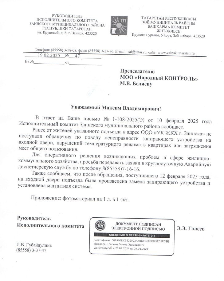 Как сообщили в Исполнительном комитете Заинского района, ранее в управляющую компанию заявки на этот вопрос не поступали. Жителям напомнили, что по вопросам жилищно-коммунального хозяйства можно обращаться в круглосуточную аварийную службу по телефону 8(85558)7-16-16.