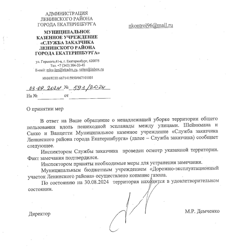 В ответ на Ваше обращение о ненадлежащей уборке территории общего пользования вдоль пешеходной эспланады между улицами. Шейнкмана и Сакко и Ванцетти Муниципальное казенное учреждение «Служба заказчика Ленинского района города Екатеринбурга» (далее — Служба заказчика) сообщает следующее.
