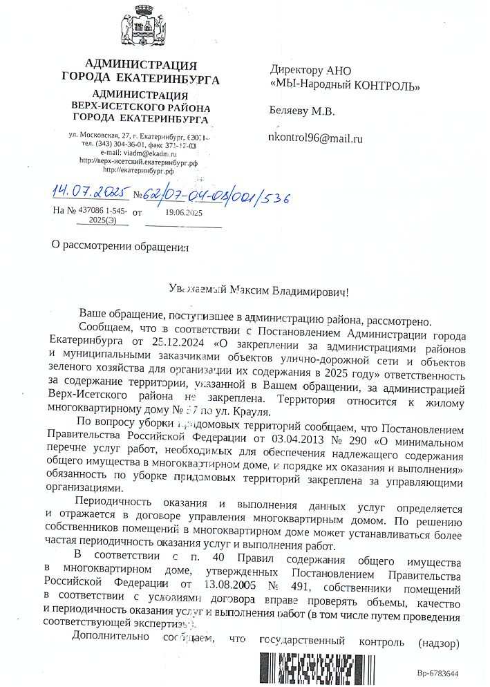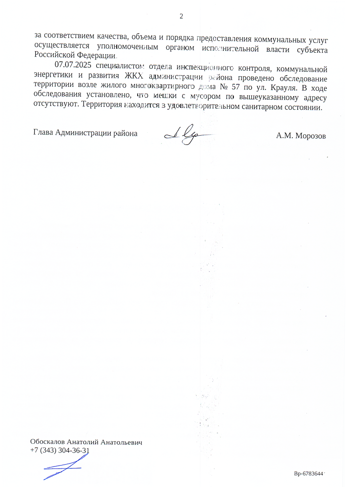 В ответе администрации указано, что данная территория относится к зоне ответственности управляющей компании, а не районной администрации. Также сообщается, что в ходе проверки, проведённой 7 июля, мусор на месте обнаружен не был, а сама территория признана находящейся в удовлетворительном санитарном состоянии.