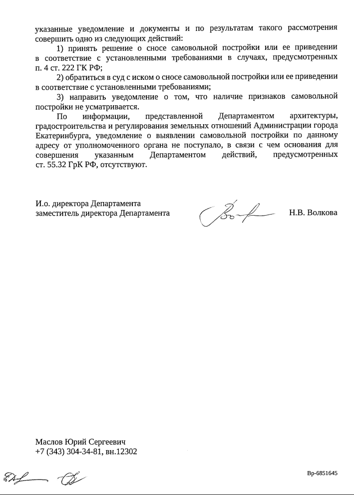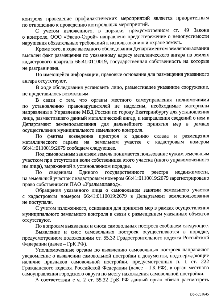 Лицо, разместившее металлический ангар, установить не удалось. Материалы по этому факту направлены в Управление МВД для розыска виновных. Что касается пристроя к складу и гаража, то основания для мер отсутствуют, поскольку собственник земли — ПАО «Уралмашзавод» — не обращался с жалобами на самозахват.