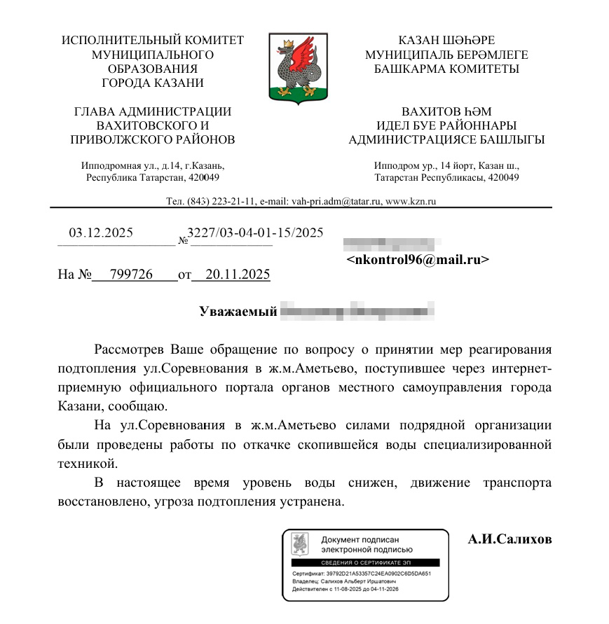 На обращение был получен ответ от Исполнительного комитета МО города Казани.