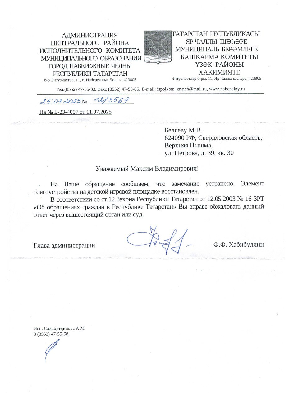 В июле из Набережных Челнов было получено обращение о поломке детских качелей во дворе дома 7 по бульвару Энтузиастов. Жители сообщали, что элемент игровой площадки для малышей длительное время находился в неисправном состоянии и просили провести ремонт.