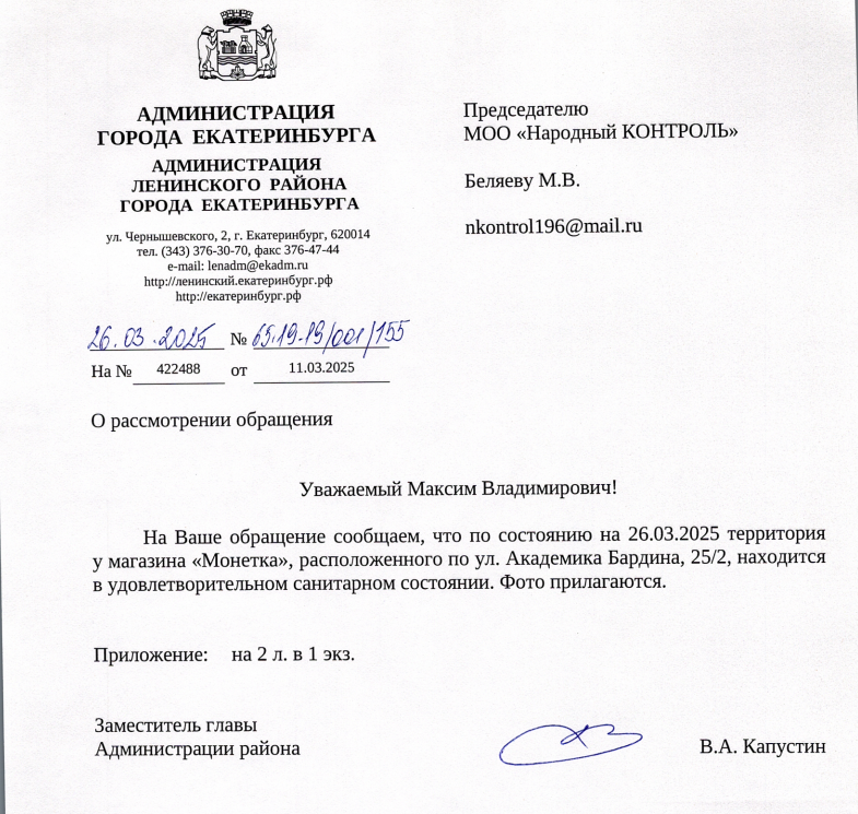 Спустя месяц, 26 марта, специалисты проверили территорию у магазина «Монетка» на Академика Бардина, 25/2. По их данным, на тот момент там уже было чисто, и состояние территории признали удовлетворительным. В подтверждение прилагались фотографии.