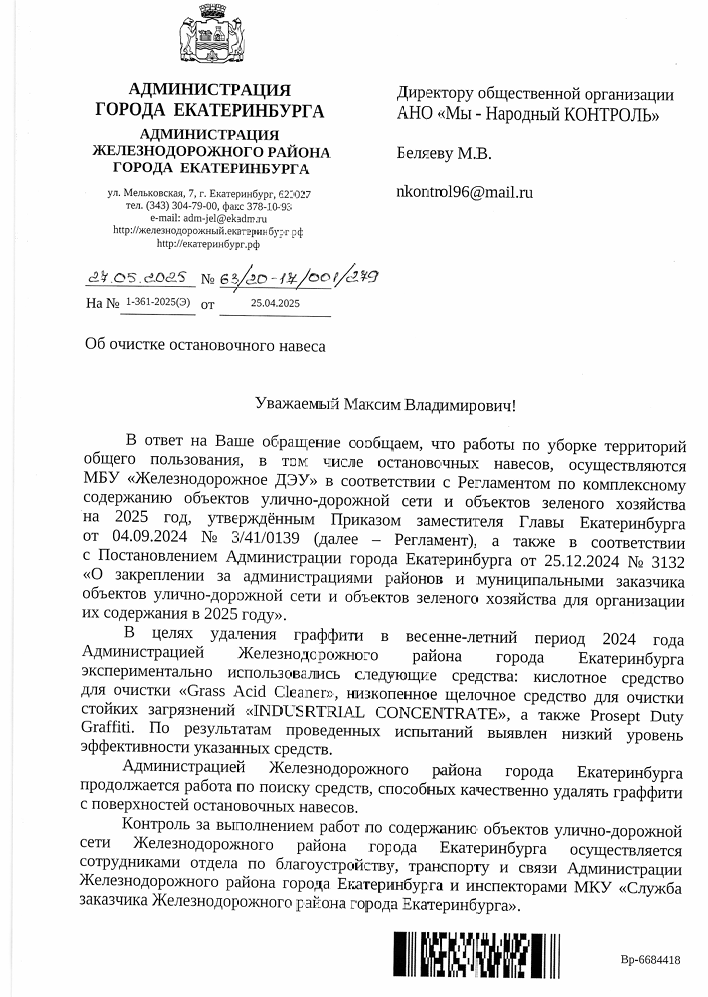 Благодарим неравнодушных граждан за Ваши обращения. Если Вы не согласны с данным ответом Администрации Железнодорожного района города Екатеринбурга, пожалуйста, сообщите об этом Нам (желательно с фото/видео доказательствами выполнения работы в неполном объеме или ее невыполнении).