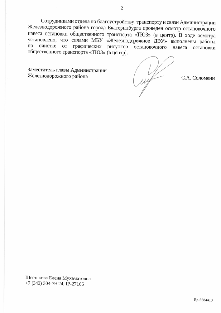 Также в официальном ответе указано, что остановка «ТЮЗ» в направлении центра была обследована, и специалисты подтвердили: павильон очищен от графических рисунков силами ДЭУ.