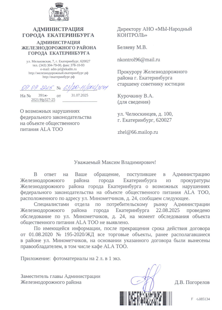 В ответе администрации указано, что на момент проверки 22 августа 2025 года кафе «Ala-Too» по адресу ул. Минометчиков, 24В обнаружено не было. По данным властей, после прекращения действия договора аренды от 1 августа 2020 года все торговые объекты, включая данное кафе, были вынесены правообладателем.