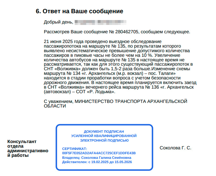 В официальном ответе сообщается, что 21 июня 2025 года было проведено выездное обследование пассажиропотока на маршруте №135. По его итогам выявлено несистематическое превышение допустимого количества пассажиров — не более чем на 10% в пиковые часы. Увеличение количества автобусов на маршруте в настоящее время не рассматривается, так как, по мнению перевозчика, для этого пассажиропоток должен быть выше в 1,5–2 раза. При этом изменение схемы маршрута №134 находится в стадии проработки, а включение заезда в СНТ «Волживка» вечернего рейса маршрута №136 уже планируется.